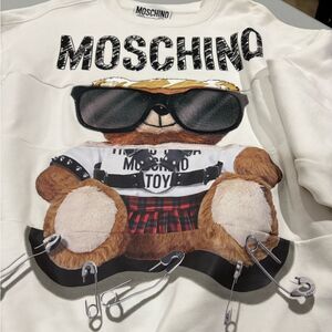 White sweatshirt featuring a teddy bear graphic with sunglasses and safety pins. Moschino branding on the front.