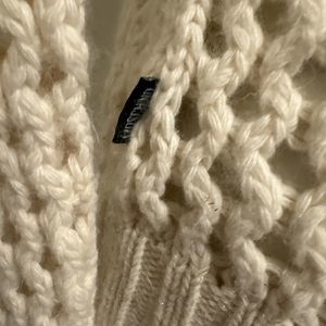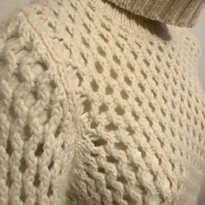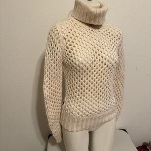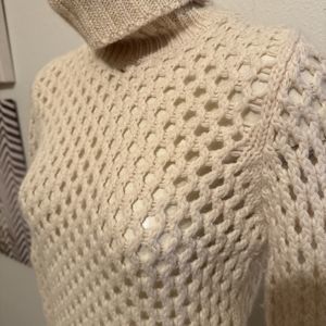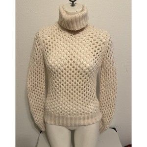 Fabulous angora wool blend open crochet sweater High turtleneck Made in Italy - Moschino Jeans Moschino tag on side seam Ivory with subtle gold thread Size s (flat and will stretch) Bust 37 Length 25 Sleeve 29 incuffed Turtleneck height 8 (unfolded) No flaws! Very unique item see all pics!