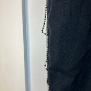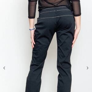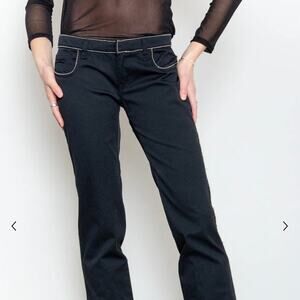 Black flare pants with a rhinestone chain trim from Moschino. In good used condition. Some areas of the rhinestones down the pant leg have lost their stitching and could be repaired.