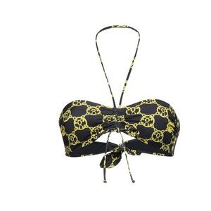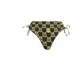 Stylish Moschino Swim bikini set with a bold yellow and black pattern. Features a strapless padded top and high-waisted bottoms. In excellent condition, worn once.