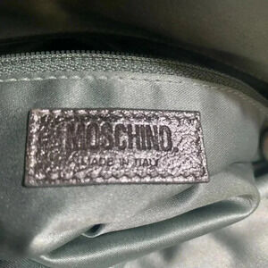 Moschino beige/ grey woven satchel handbag with silver metallic leather strap & trim with silver tone hardware main compartment satin fabric lining 1 zip pocket at interior wall logo at front minor mark at lining & exterior hight 11” width 11.25” depth 3” strap drop 4.25” Bag dimensions are based on approximate measurements before placing an order please take a moment to view all photos using feature for a closer look