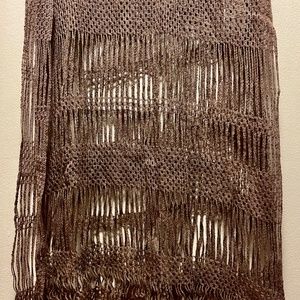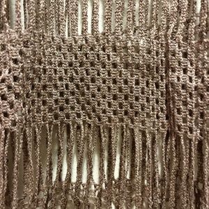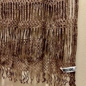 Intricate cotton crochet grey-brown scarf by Moschino. 15" width and 54" length, plus 2" fringe. in very good condition. $89