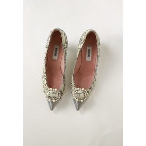 Sz 36. Moschino fuzzy diamond pearl pointed toe pumps in silver. Really nice pre-owned condition. Wear on soles. Slight scuffing at end of pointed toes. Kitten heels measure approx 2" in the back.