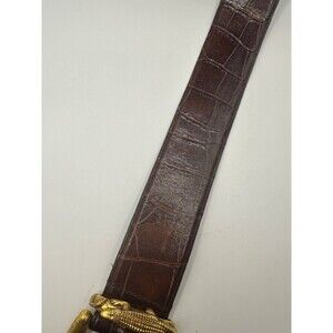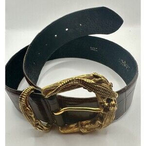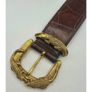 This Moschino soft faux aligator leather belt with brass buckle is a stylish waist belt designed for women with a medium width, this vintage piece features a brass buckle for added flair. The belt comes in a classic brown color, making it a versatile accessory that can easily complement various outfits. With its medium size and luxurious materials, this belt is a timeless addition to any fashion-forward wardrobe. Length 34" Width 2" Buckle 2.5 x 3.25