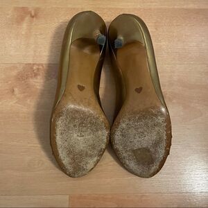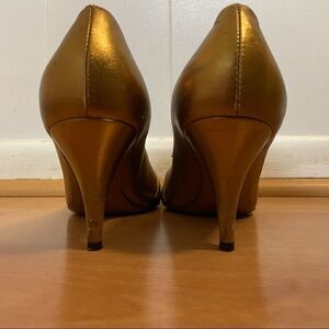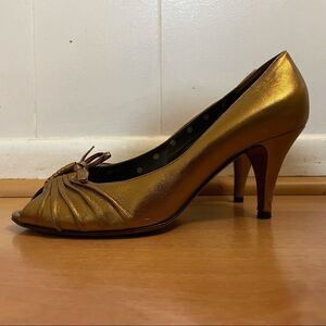 These cute gold Moschino heels are in good condition. They have been worn, and have some scuffing and discoloration on the heels. However, the bottoms are still in great shape, and there’s plenty of wear left in them. There are from Moschino’s Cheap and Chic Cheap Collection. They give off total 70’s disco vibes! Made in Italy. Size EUR 37.5.