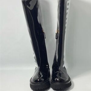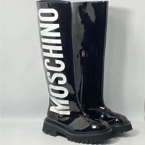 These knee-high boots from Moschino are crafted of faux patent leather with an oversized printed logo at the side.