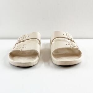 fixed buckles, double strap. pool slides, sandals, cream, ivory, white, waterproof, washable