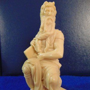 This statue features Moses holding a book with the Ten Commandments. He is seated on a pedestal. Statue features intricate details of Moses' face and attire. Statue was purchased at the Vatican in Italy in 1965. Back of statue has ITA to signify that it was made in Italy.
