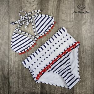 Luxuriate poolside in this dreamy blue and white tassel bikini, where artfully placed fringe dances with each gentle summer breeze. Like waves lapping at a pristine shore, the high-waisted design captures that timeless grace of seaside glamour, while the modern silhouette promises both comfort and ethereal charm.