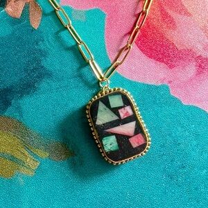 This beautiful mosiac necklace is so unique and lovely! The stainless steel 18k gold plated chain is 18 inches and adjustable with a 3 inch extender and a lobster claw clasp. It also comes in a cute gift box.