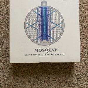 MosqZap electric bug zapping racket in white and blue. Efficient and easy to use.