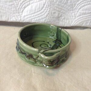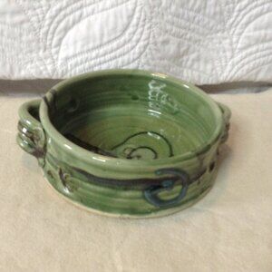 Mosquito Mud Green Studio Dish/Bowl. Signed, Hand thrown, Artistic, Collectible. This handcrafted, hand thrown, Handled piece is very Eclectic and Beachy. Signed with Spiral Pattern; 2" high, 6" diagonal around. Great piece for your collection.