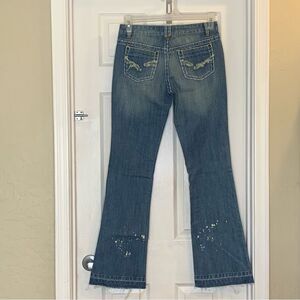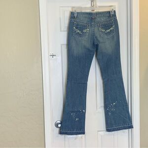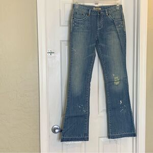 Size 10 Sample jeans Waist 15.25” flat Rise 8.5” Leg opening 9” Inseam 32” Distressed