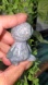 Made of moss agate, a type of chalcedony which contains inclusions of minerals that look like moss or lichen, giving it the characteristic green and white pattern seen in the image.
