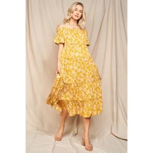 Flowy tired maxi dress featured in a floral pattern with an off-the-shoulder neckline and flutter sleeve. Color is a light greenish yellow.
