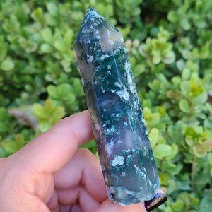 Absolutely stunning moss agate tower. Looks just like snow fallen on the trees. Stands 3.5 inches tall.