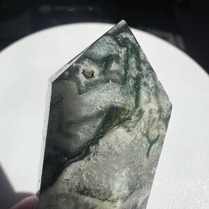 A moss agate crystal double terminated meditation point features a lush, green, plant-like pattern within a clear matrix, often with a pretty druzy features. Metaphysically, it fosters emotional balance, tranquility, and abundance, while the druzy enhances its calming and amplifying effects.