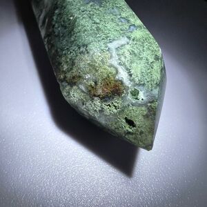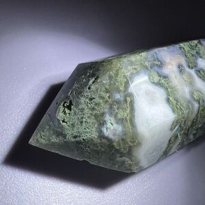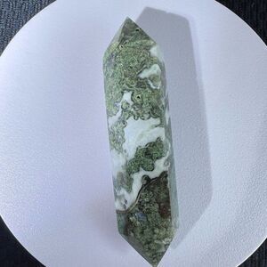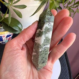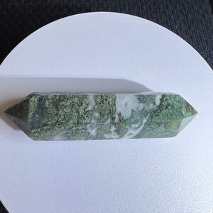 A moss agate crystal double terminated meditation point features a lush, green, plant-like pattern within a clear matrix, often with a pretty druzy features. Metaphysically, it fosters emotional balance, tranquility, and abundance, while the druzy enhances its calming and amplifying effects.