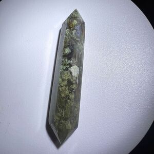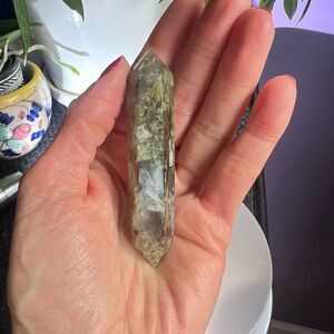 A moss agate crystal double terminated meditation point features a lush, green, plant-like pattern within a clear matrix, often with a pretty druzy features. Metaphysically, it fosters emotional balance, tranquility, and abundance, while the druzy enhances its calming and amplifying effects.