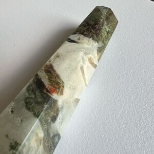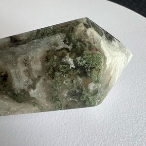 A moss agate crystal meditation wand is a tool imbued with grounding and nurturing energy. Delicate druzy. Known for its green, moss-like inclusions, it enhances emotional balance, boosts self-esteem, and promotes tranquility. This wand aids in connecting with nature, fostering growth, and attracting abundance.