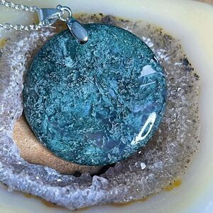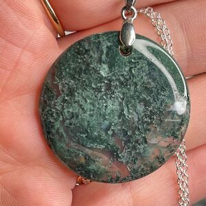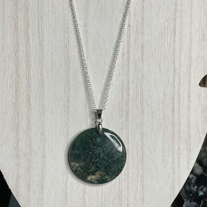 Moss agate circle coin pendant necklace silver plated 1.5” 20 inches