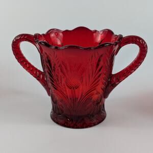 Title: Mosser Inverted Thistle Glass Sugar Bowl Ruby Red Serving Jar Cold Press MCM