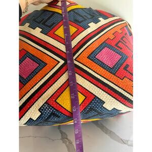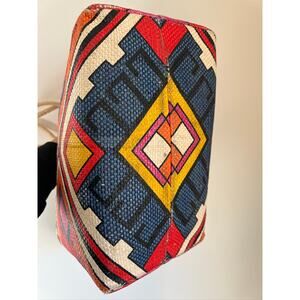 Bright and bold SHELOON handbag made of 100% paper with a unique geometric pattern. Perfect for adding a pop of color to any outfit, ideal for casual outings or beach days.