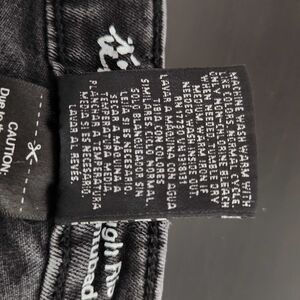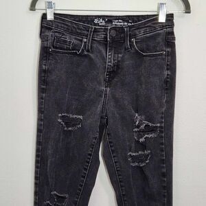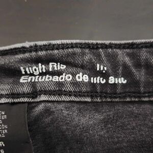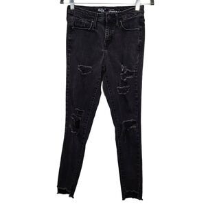 Mossimo skinny black jeans. High-rise jeans feature pockets in front and back. Zipper and button closure. Material is called "Power Stretch." Black denim fabric has multiple distressed areas/holes including cut-off hems that are slightly shorter in front. Good condition!