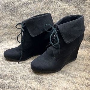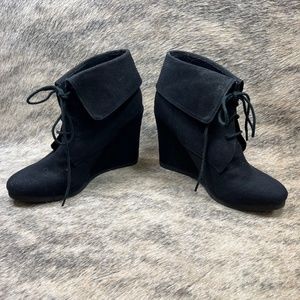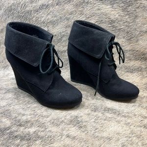 Nice, used women's size 10 black booties wedge heels. Lightly used, very comfortable, faux black suede with durable and grippy soles. Has a classy, playful, yet professional look. Size women's 10, fitting true to size. In hardly worn condition. The faux suede does capture lint/dust a bit so may have a few pieces hanging on.