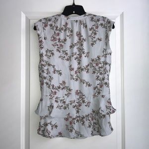 Loose fit peplum-style blouse with cap sleeves. Buttons halfway down the front with two pockets. Color is blue-grey with pink and brown flowers.