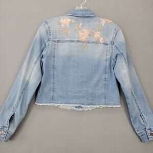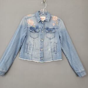 Mossimo Supply Co. Women's Size XS Jacket Blue Jean 1% Stretch Distressed Grunge Embroidered Floral Y2K Trucker Styled Denim Raw Hem Button Up Long Sleeve Pockets