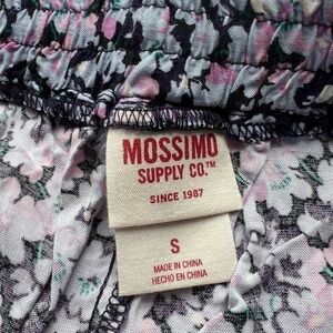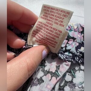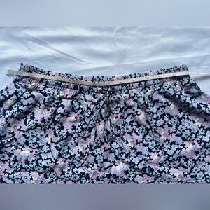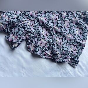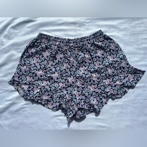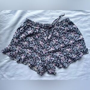 Mossimo Blue Purple Floral Ruffle Shorts. Black base with light blue and purple floral print. Elastic drawstring waistband. Side pockets. Ruffle along the bottom. Worn once, like new. Size Small.