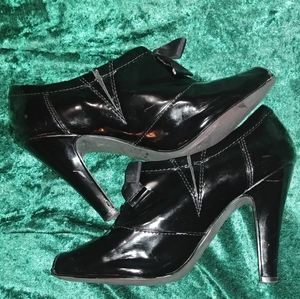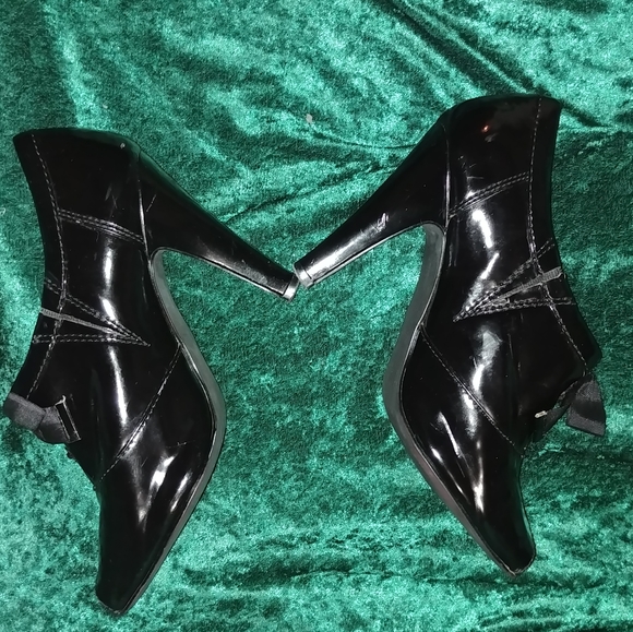 Black patent leather, peep toe booties.