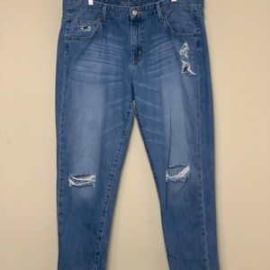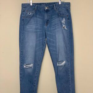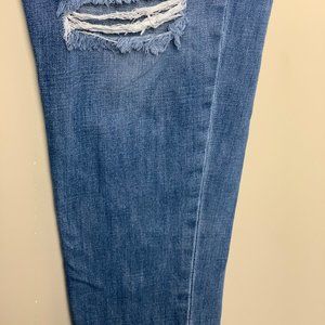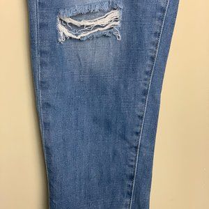 These are Mossimo Boyfriend Crops in size 14 /32, medium blue and distressed. The printed tag is worn (pictured above). Other than this, the jeans are in great condition. No wear on hems or in crotch area. Distressed look on both pockets, around the knees, and the hems. Perfect if paired with low cut sneakers or sandles. Just in time for Spring!