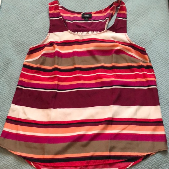 Mossimo Bright Striped Shell in size MEDIUM. Gently worn; EUC. Back is racer back cut with some rouching. Colors of stripes in order are maroon, ivory, watermelon red/pink, black, maroon, peach, ivory, watermelon red/pink, deep fuchsia, and taupe.