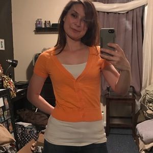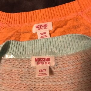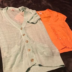 Two Mossimo Cardigans, both are extra small. The light blue one is hip length and the orange one is waist length.