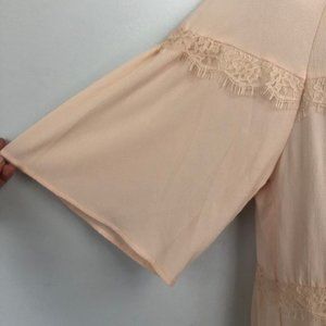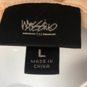 Mossimo creamy peach colored top. Size Large. 98% polyester, 2% spandex. Unlined. Button and loop closure at the back neck. It flows and hangs nicely. Worn, but in great condition. Tag with material and washing info has been removed, but the tag in the picture is from the exact same top, but in a different color.