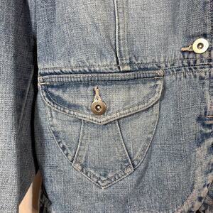 Good pre-owned condition. Due to wear and the nature of denim, there is fraying at the edge of wrists. There is also a very light stain on the left sleeve, which I can see under the bright photography lights, but is harder to find in normal light.