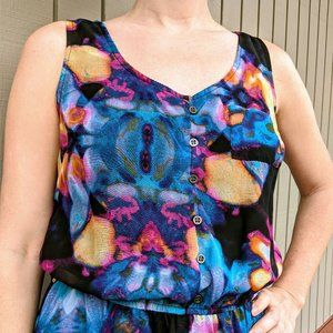 Mossimo, Bright Floral Tie-Die Print. Chiffon Hi-Lo Hem. Sleeveless, Button detail, shirt style top. Gathered elastic waist. Beautiful for day, work, or resort wear.
