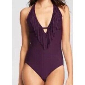 Elevate your swimwear game with this stunning Mossimo Fringe Halter Swimsuit. The one-piece swimsuit features a solid chocolate cherry color and is made of 88% polyester and 12% spandex, ensuring a comfortable fit. The halter strap adds a touch of elegance and the fringe accents give it a unique, playful look. This swimsuit is perfect for any woman looking for a stylish and comfortable option. This one-piece design provide ample support, while the solid pattern and vintage-free design make it a timeless addition to any swimwear collection. Get ready to turn heads at the beach or pool.