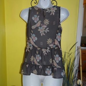 This item is used but still in good condition. Mossimo gray sheer flower top in woman's size small. It has a beautiful flower and bird print. Single button back closure. Very lightweight and flowy. Cute summer piece.