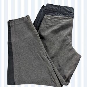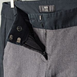 Figure flattering charcoal gray stretch cotton dress ankle pants with black cotton twill vertical bands running down each outside leg. Button, clasp and zip closure. Stretchy, comfy, forgiving cotton/Spandex fabric that looks a little like wool! Two front slash pockets, two decorative back pockets. Perfect paired with a blazer and heels or a T and sneakers. Excellent used condition, there's a tiny slub on the back, see last pic.