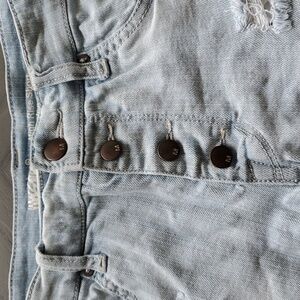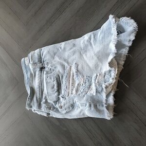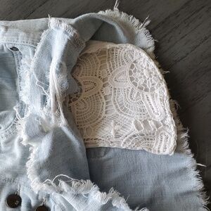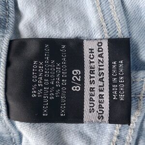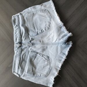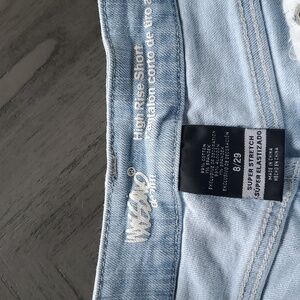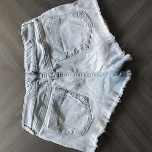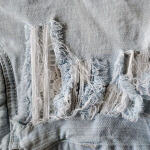 These blue jean shorts from Mossimo feature a high-waisted design with a trendy distressed look and frayed edges. The fitted style and cut-off appearance make them perfect for casual outings or the beach. Lace pockets give the holes a cool vibe. Approx 2.5 inch inseam. Super Stretch material. Size 8/29. Great Pre-loved condition. Rock these with a cute crop top or bodysuit.