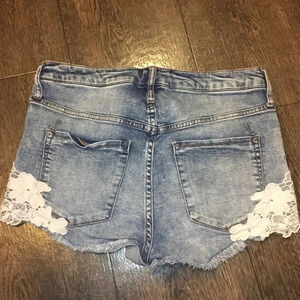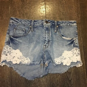 These Mossimo shorts feature a light wash denim, lace detail on the thighs, a high rise, and raw hems.