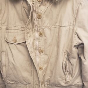 a tan, waist-length jacket with a faux fur-lined hood.
