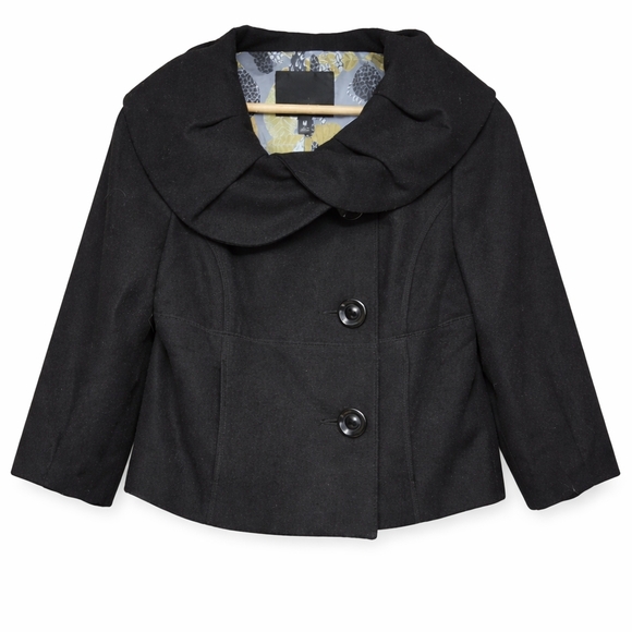 Stylish Mossimo cropped jacket featuring a dramatic oversized collar and flattering tailored seams. This chic black jacket has a modern cropped silhouette with large statement buttons and a beautiful patterned lining in gray, black, and gold tones that adds a unique designer look.