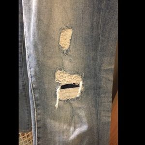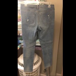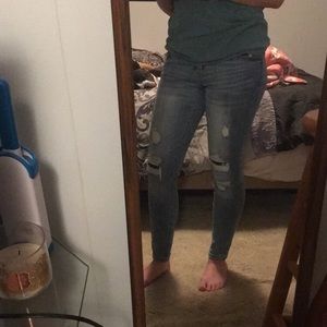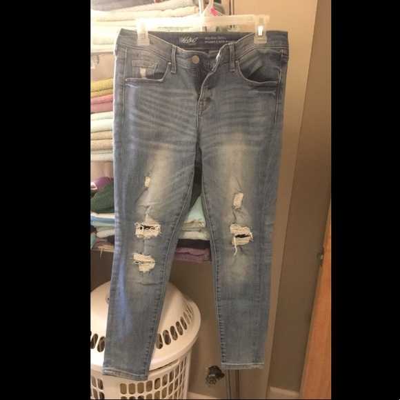 Mid-Rise Skinny. Size 4/27. Mossimo brand from Target. These jeans are a light wash and as you can see in the pics, there are patches underneath the holes on each leg (dark denim color). Excellent condition! Fit true to size. I’m typically a 4/5 and they fit me well.