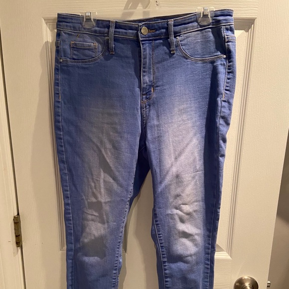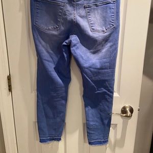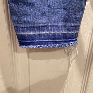 Size 10, very bright blue/denim color, distressed at bottoms, high waisted