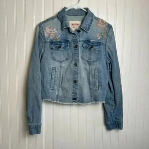 Mossimo Light Wash Floral Embroidered Crop Denim Jacket Raw Edge C46