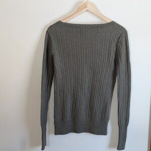 Moss green long-sleeved ribbed top with lots of stretch. Smoke-free, pet friendly home.